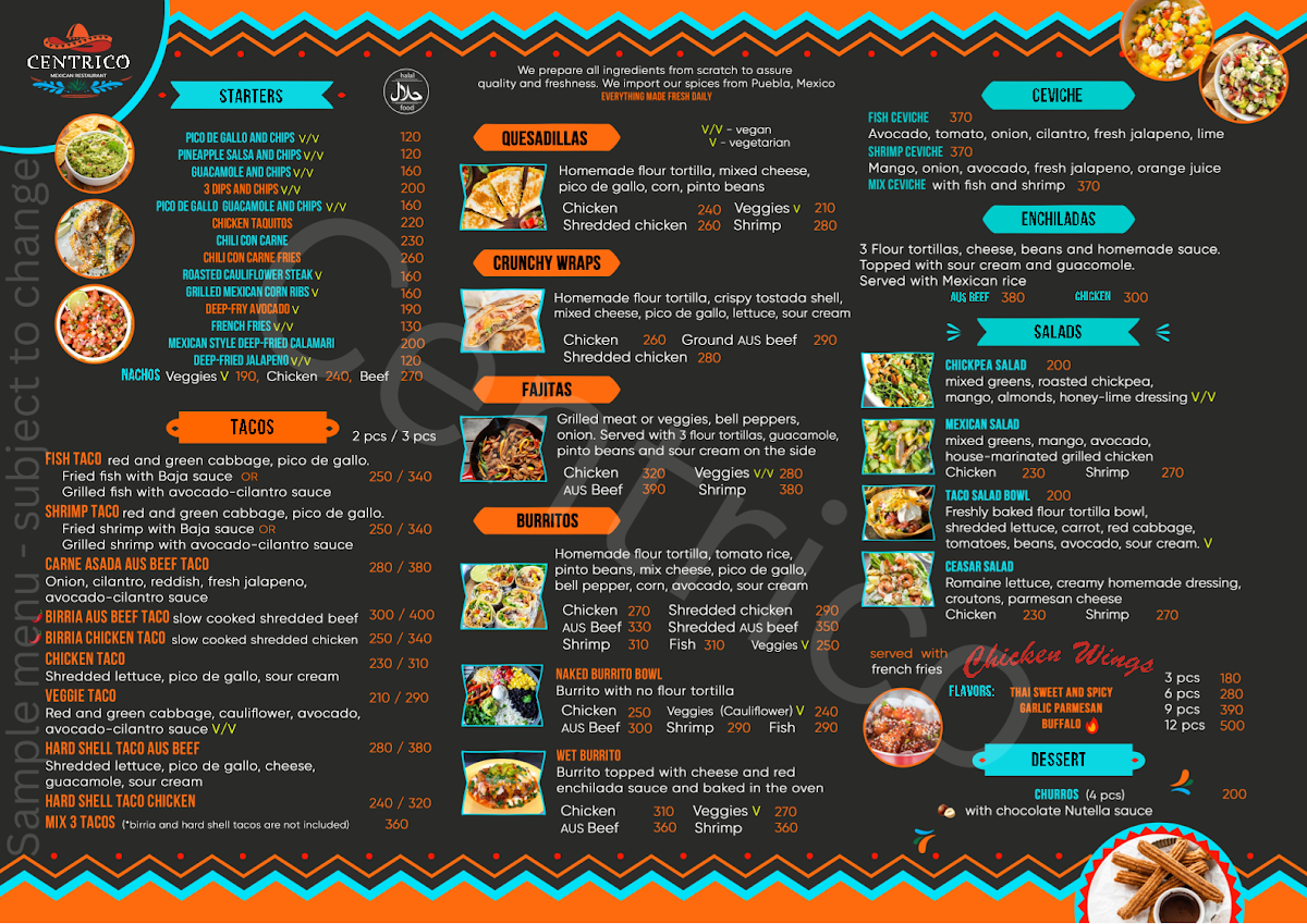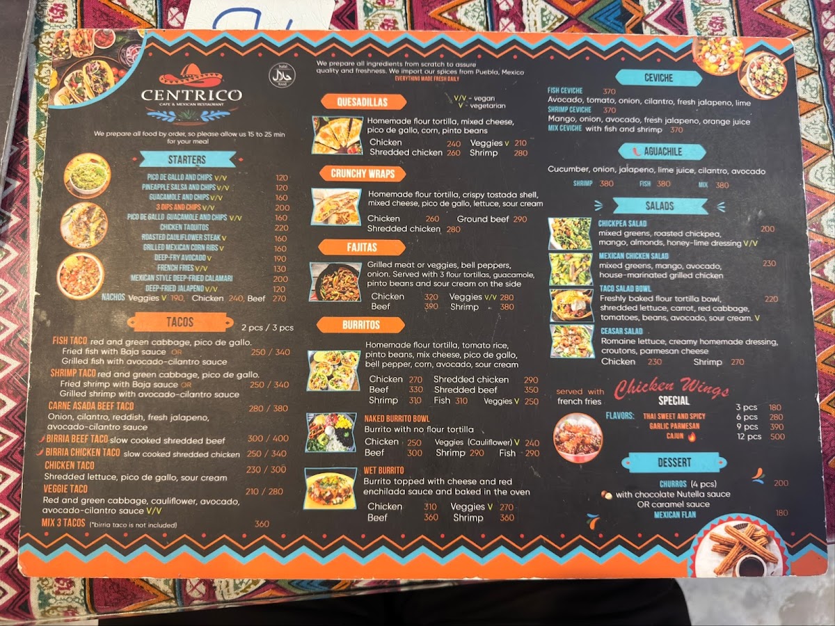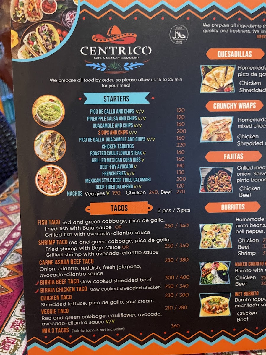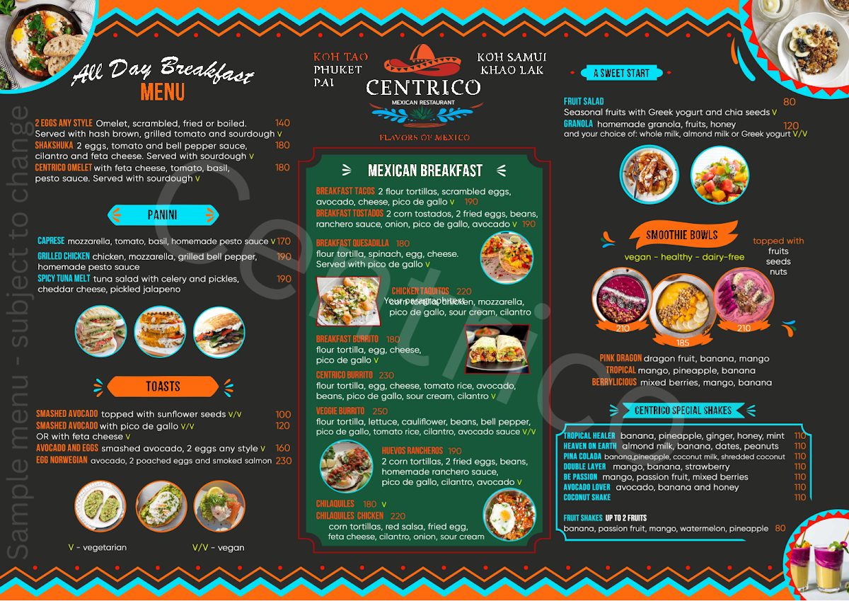 Introducing the menu at Centrico Cafe and Mexican Restaurant Halal, situated at the stunning Sairee Beach in Koh Tao, Thailand, is a delightful culinary journey through vibrant Mexican flavors. The options are plentiful!